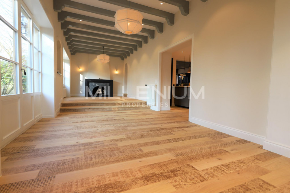 Un grand salon avec cheminée en enfilade avec la salle à manger donnant sur un joli jardin planté de beaux arbres, de rosiers et autres végétaux, une bibliothèque bel espace de détente, une douche à l'italienne avec WC complètent l'ensemble des pièces.